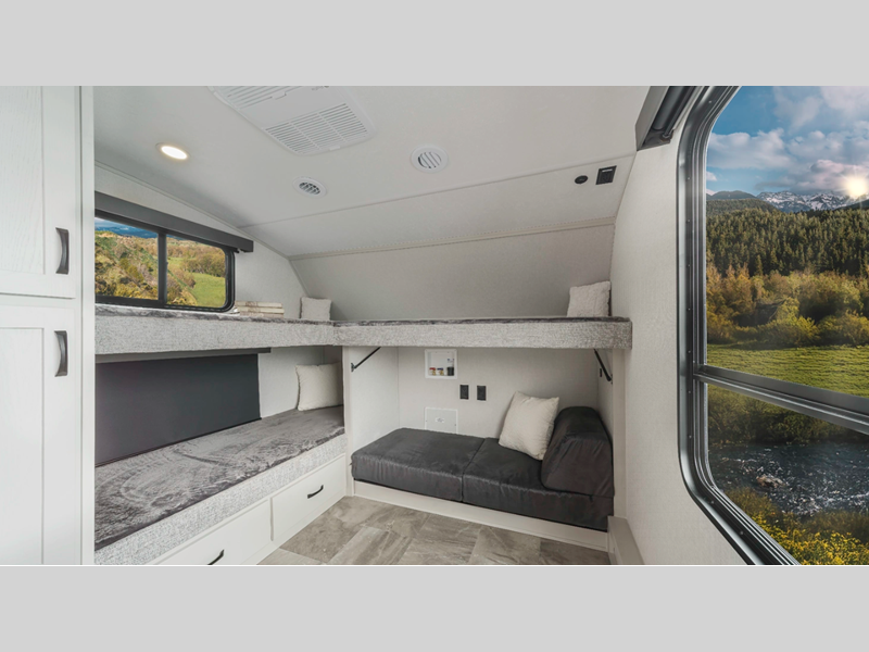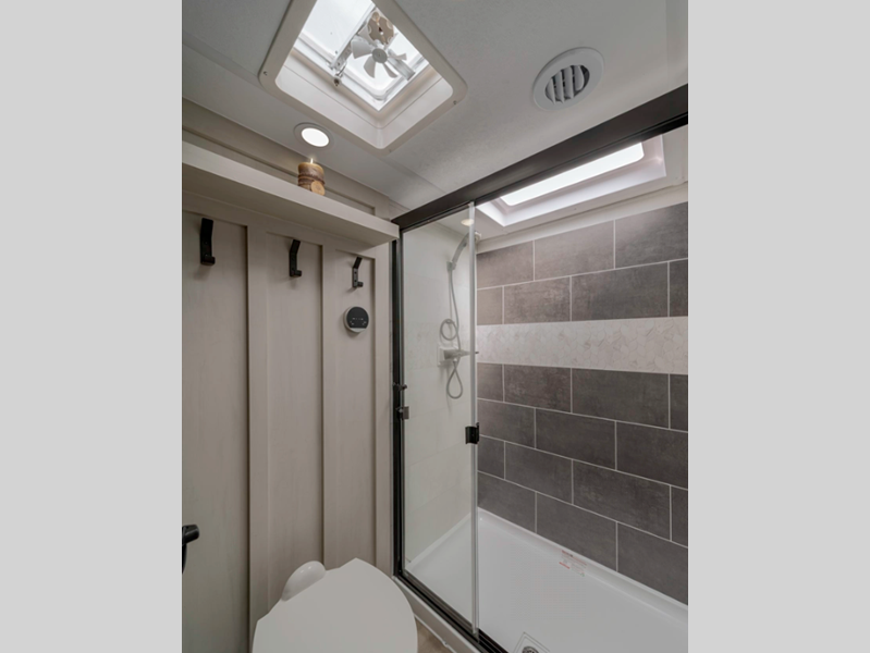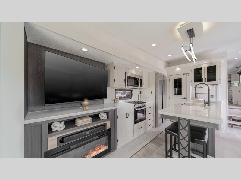 The Tri-Tex powder coated frame technology is up to 5X more weather resistant, and the Equa-Flex suspension with anodized shackles, bronze bushings, and greasable zerk fittings will make towing easier than ever. There is also a Solar Source+ package with an upgraded 200W roof-mounted solar panel and a lithium-ready converter with a 30AMP charge controller to support off-grid capability. There are many new features that are sure to catch your eye, along with new decor options, an upgraded Carbon and Walnut entertainment center, an upgraded heat pump in all factory installed GE A/Cs, and more.