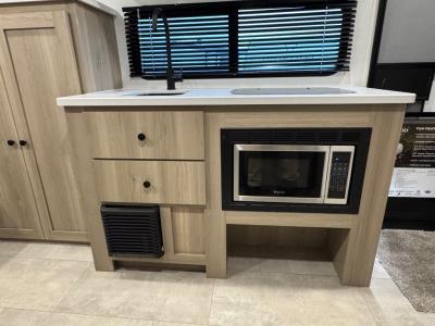 Time spent in this spacious travel trailer will be time well spent! You can wake up each morning on the front queen bed that includes an overhead shelf and a wardrobe close by, allowing you to grab some clean clothes. There is also a rear corner full dry bath, which is a comfort you won't want to camp without. A full kitchen is complete with a two-burner cooktop, microwave oven and a refrigerator, allowing you to cook and store your favorite meals. And don't overlook the sofa with a 30" x 15" table within the slide out for dining or card game space!