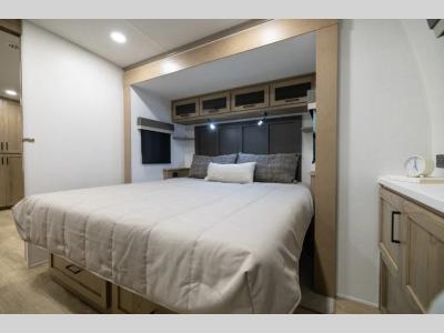 Sleeps 2 Slides 2 Length 29 ft 11 in Ext Width 8 ft Ext Height 11 ft 7 in Hitch Weight 1010 lbs Dry Weight 7649 lbs Cargo Capacity 2161 lbs Fresh Water Capacity 54 gals Grey Water Capacity 78 gals Black Water Capacity 39 gals Furnace BTU 35000 btu Available Beds King Refrigerator Type 12V Cooktop Burners 3 Number of Awnings 1 LP Tank Capacity 30 Lbs. Water Heater Capacity 6 gal Water Heater Type Quick Recovery Gas/Electric TV Info LR Smart TV Awning Info 22' Power w/Rain Dump and LED Lights Axle Count 2 Number of LP Tanks 2 Shower Type Shower w/Seat Electrical Service 50 amp Similar Travel Trailer Floorplans
