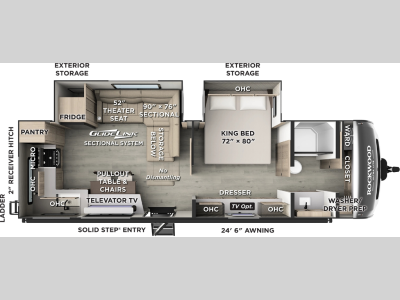 They are each constructed with six-sided aluminum framed walls, floor and roof, and include complete composite wall construction for added durability and insulation. You will also appreciate the enclosed underbelly for added protection! Inside, there is hidden hinge cabinet doors, roller shades, solid surface kitchen countertops, and lino flooring in the slides.