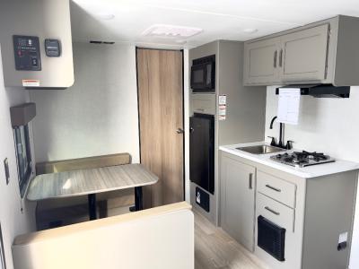 Camping trips just got easier travel trailer that can sleep three to four each night! There is a front Olympic RV queen bed with an overhead shelf and bedside wardrobe for your things. A two-burner cooktop and microwave oven will let you make breakfast for your crew, and a booth dinette provides a place to dine together, as well as convert to sleeping space for a guest or two little ones. This travel trailer also includes a full rear bath, complete with a shower, toilet, and vanity with a sink and overhead cabinet!