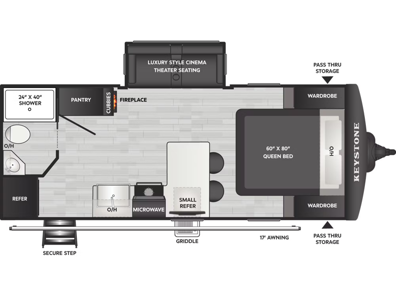 The island kitchen sets this floorplan apart from most lightweight trailers in its class. Theater seating positioned directly across from the fireplace creates a true living room feel. The private front bedroom with a residential queen bed gives you separation and real sleeping comfort.
